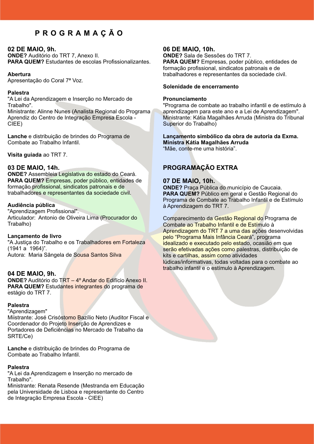 Confira a programação completa que o TRT 7 preparou para a Semana Nacional de Aprendizagem que ocorrerá de 02 a 06 de maio deste ano.