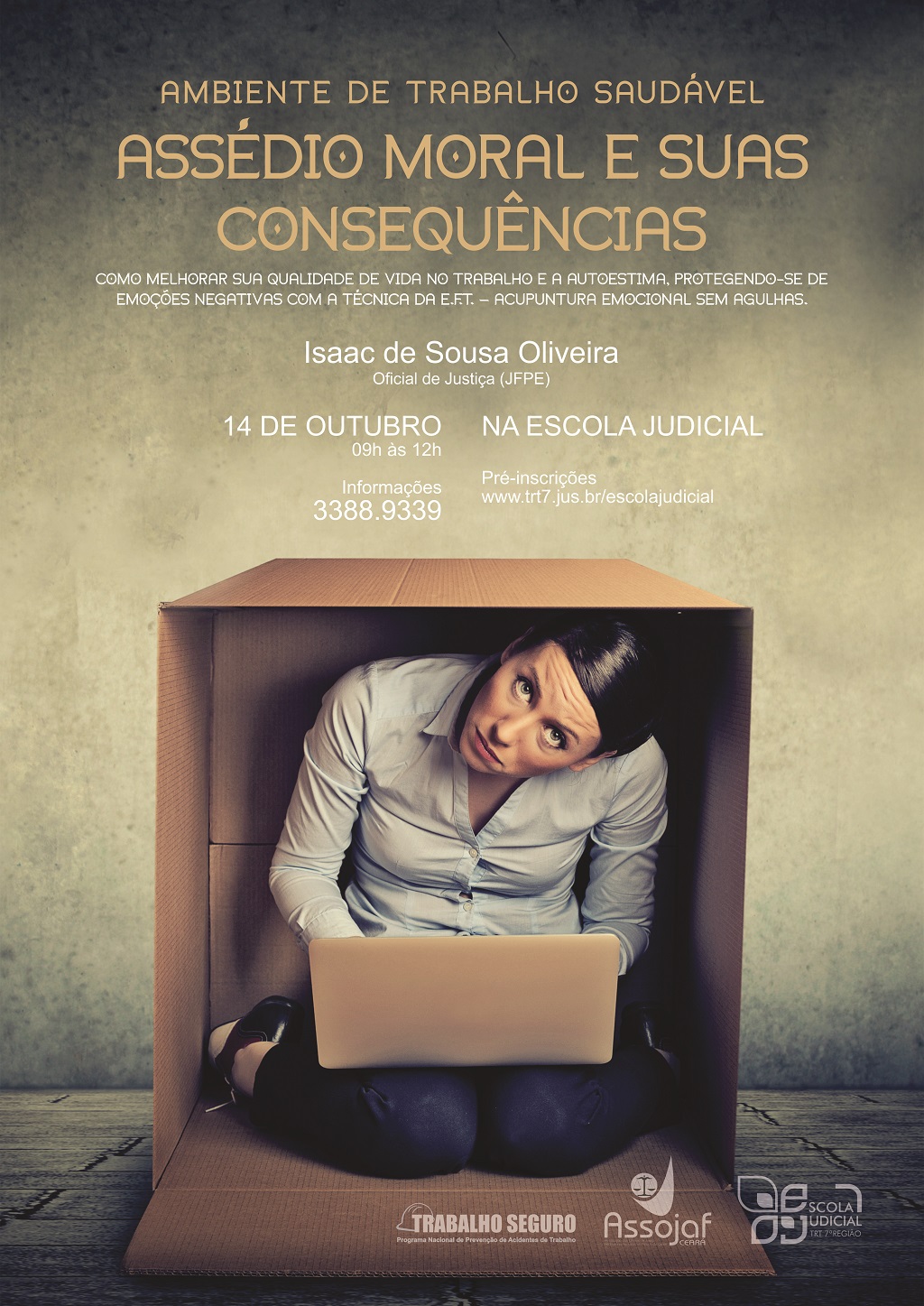 Pensando na melhoria da qualidade de vida no trabalho e autoestima dos servidores do TRT da 7° Região, a Escola Judicial e a Associação dos Oficiais de Justiça e Avaliadores Federais no Estado do Ceará - ASSOJAF, em parceria com o Programa Nacional de Prevenção de Acidentes de Trabalho - Trabalho Seguro, realizarão no dia 14 de outubro, a palestra “Ambiente de trabalho saudável: assédio moral e suas consequências”. O evento será conduzido pelo oficial de justiça e avaliador federal da Justiça Federal de Pernambuco, Isaac de Sousa Oliveira, das 9h às 12h, na EJUD7.