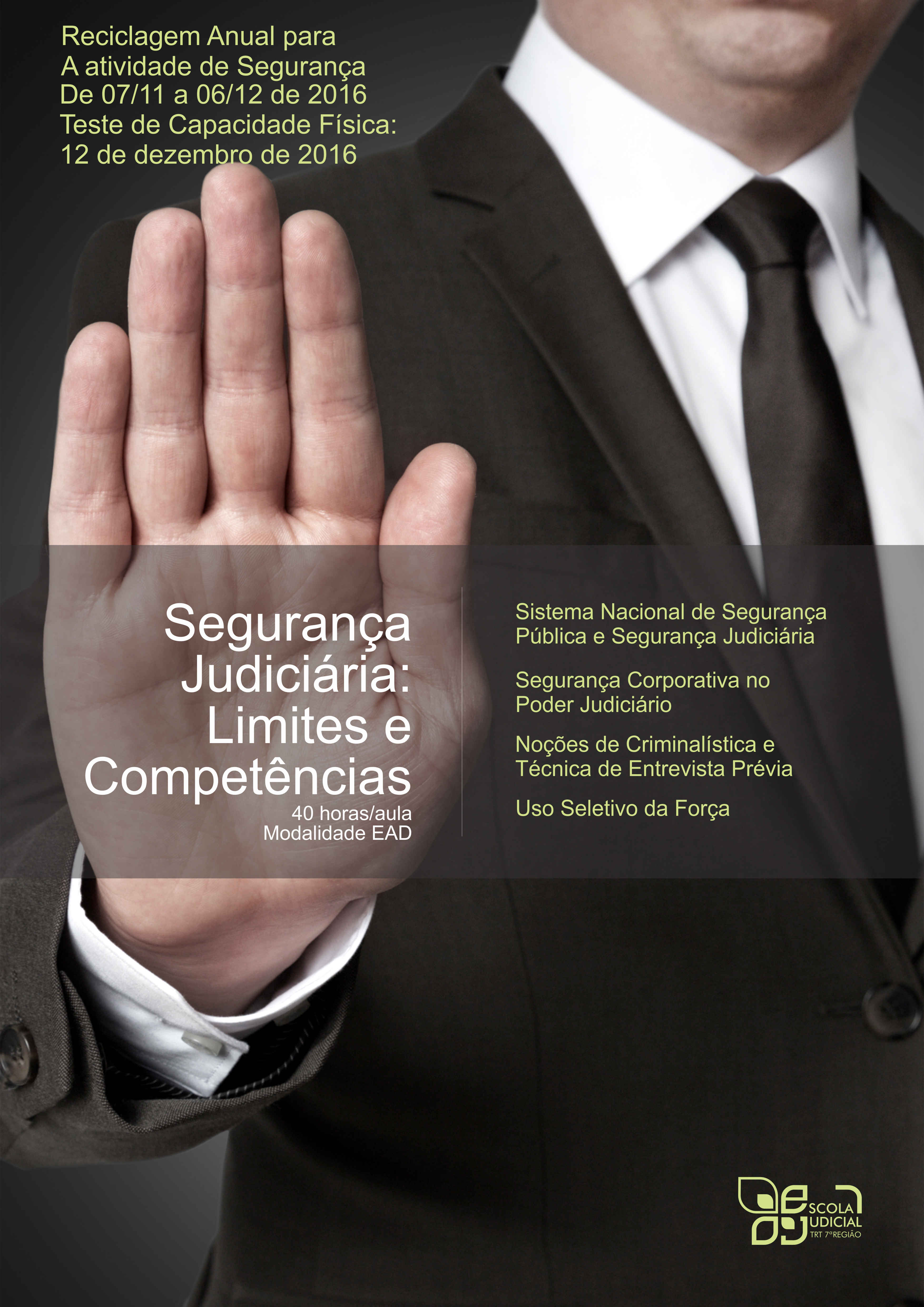 Com o objetivo de promover o aperfeiçoamento continuado dos agentes de segurança do TRT da 7° Região, a Escola Judicial promoverá o curso “Segurança Judiciária: Limites e Competências”, abordando temáticas necessárias ao desenvolvimento de um serviço de segurança eficaz e adequado às necessidades da justiça do trabalho no ceará.