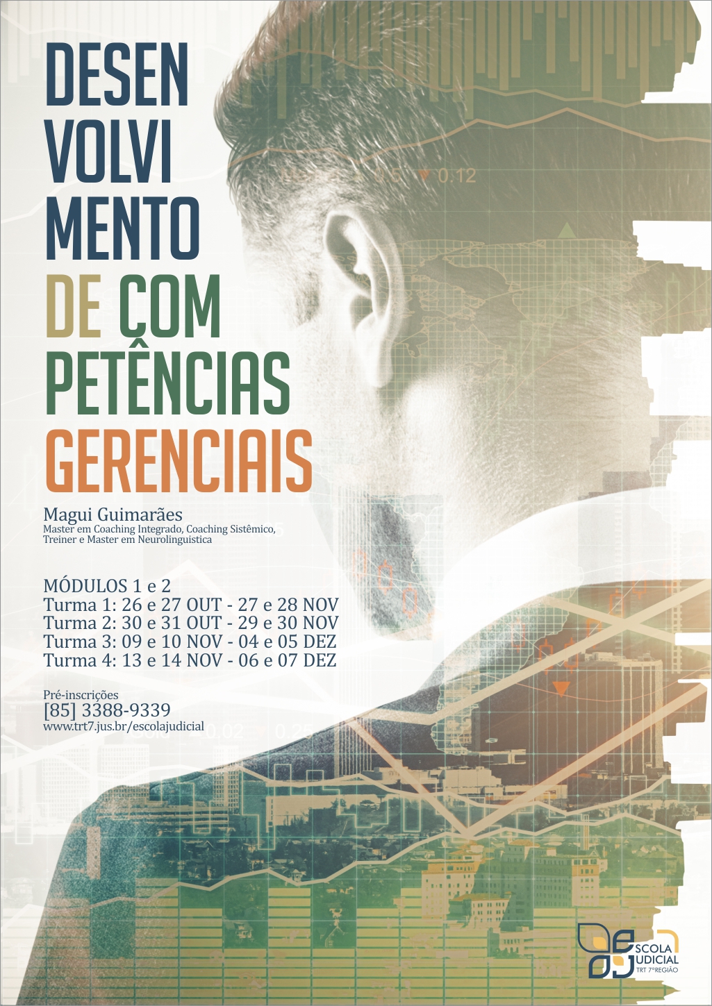 O TRT da 7ª Região, por meio da Escola Judicial, promoverá o curso de Desenvolvimento de Competências Gerenciais, que será ministrado por Margarida Maria Soares Guimarães, Especialista em Psicopedagogia e Diretora da Escola de Ciências Comportamentais, destinado aos servidores ocupantes de funções comissionadas de natureza gerencial.