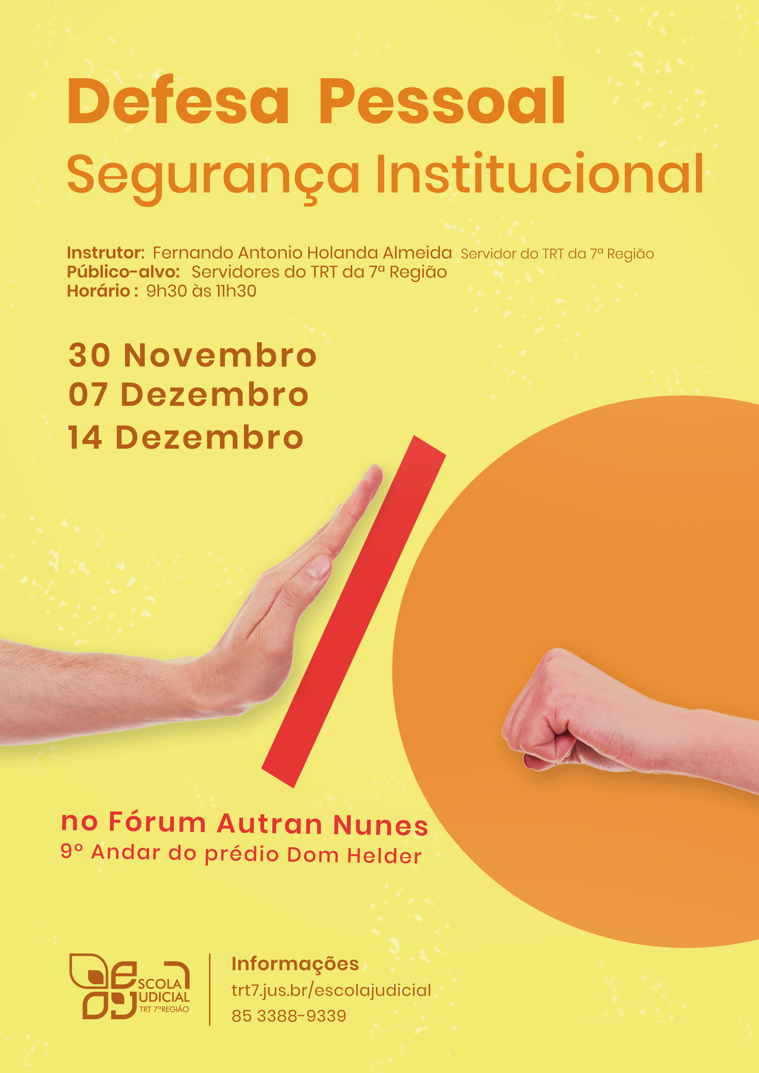 Com o intuito de trabalhar auto-controle, aspecto marcial e emocional dos servidores, a fim de que saibam como agir no seu local de trabalho e em qualquer lugar, a Escola Judicial abre inscrições para o curso “Defesa Pessoal: Segurança Institucional” que será ministrado pelo servidor do TRT da 7ª Região, Fernando Antonio Holanda Almeida.