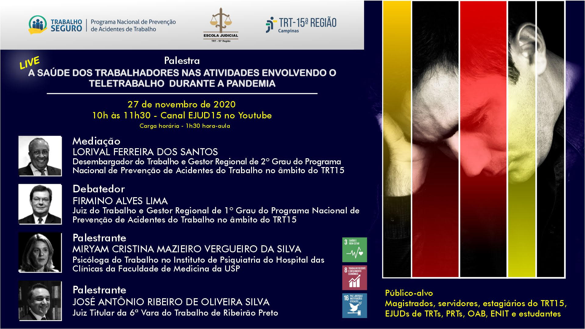 A Escola Judicial do TRT15 convida para a palestra "A Saúde dos Trabalhadores nas Atividades envolvendo o Teletrabalho durante a Pandemia" que será ministrada pelo Dr. José Antonio Ribeiro de Oliveira Silva, Juíz Titular da 6° Vara do Trabalho de Ribeirão Preto; Miryam Cristina Mazieiro Vergueiro da Silva, Psicóliga do Trabalho no Hospital das Clínicas da Faculdade de Medicina da USP e Dr Firmino Alves Lima, Juíz do Trabalho e Gestor Regional de 1° Grau do Programa Nacional de Prevenção de Acidentes do Trabalho no âmbito do TRT15, no dia 27 de Novembro, das 10h ás 11h30.