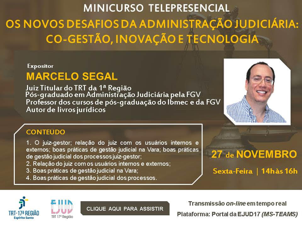 Escola Judicial do TRT da 17ª Região está convidando Magistrados e Servidores de outros Tribunais Trabalhistas para participar do nosso próximo Minicurso telepresencial, abordando o tema "Os novos desafios da administração judiciária: co-gestão, inovação e tecnologia", a ser realizado no dia 27/11, de 14h às 16h.