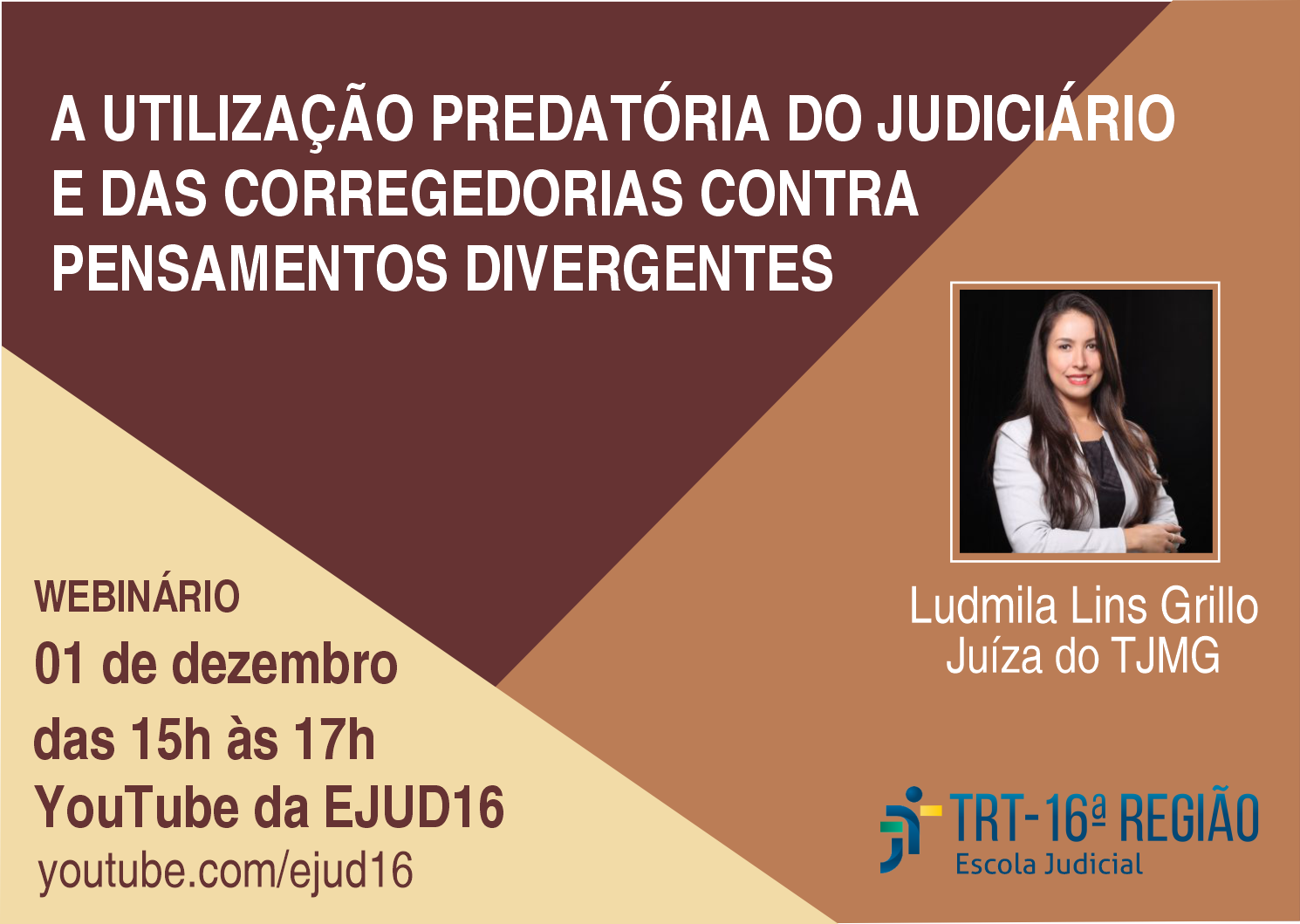 No próximo dia 01 de dezembro, terça-feira, das 15h às 17h, a EJUD16 apresentará o webinário “A UTILIZAÇÃO PREDATÓRIA DO JUDICIÁRIO E DAS CORREGEDORIAS CONTRA PENSAMENTOS DIVERGENTES”, que será ministrado pela Juíza do TJMG, Ludmila Lins Grilo.