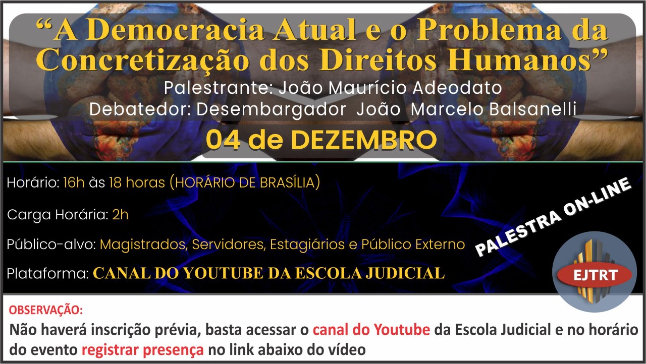 O TRT da 24ª Região convida para a palestra on line sobre "A Democracia Atual e o Problema da Concretização dos Direitos Humanos" que será realizada no dia 04/12 das 16h às 18h. , pelo palestrante: João Mauricio Adeodato.