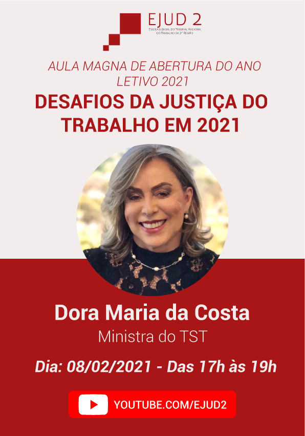 A Escola Judicial do TRT da 02ª Região, convida magistrados e servidores de outros regionais para a Webpalestra: Desafios da Justiça do Trabalho em 2021, que será realizada no dia 08 de fevereiro/2021, das 17h às 19h, no canal do Youtube da EJUD2, com a Exma. Sra. Ministra Dora Maria da Costa, Diretora da Enamat.