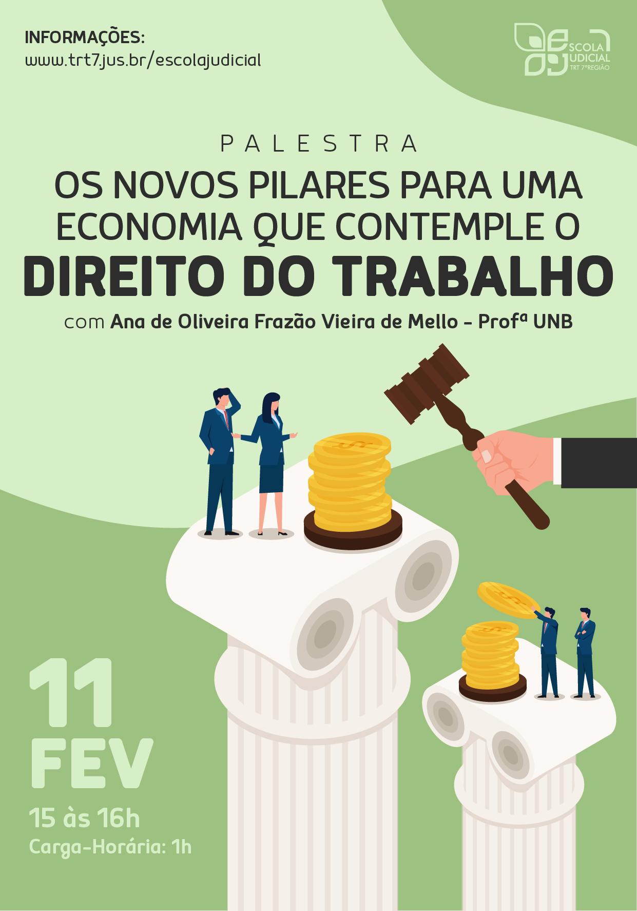 A Escola Judicial do TRT da 07ª Região promoverá, no dia 11 de fevereiro, das 15h às 16h, a palestra “Os novos pilares para uma economia que contemple o Direito do Trabalho”, pela Prof. Ana de Oliveira Frazão, que será transmitida pelo canal do TRT/CE no Youtube.