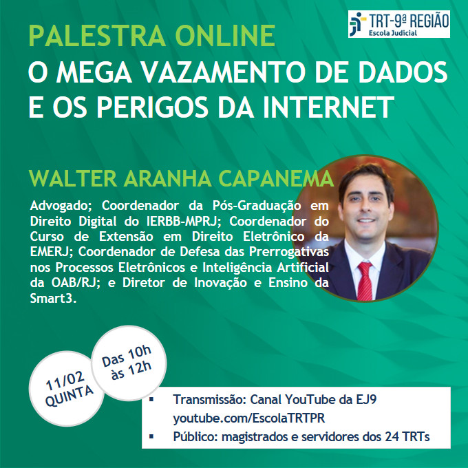 A Escola Judicial do TRT 09 convida para a palestra on line " O MEGA VAZAMENTO DE DADOS E OS PERIGOS DA INTERNET", que será realizada no dia 11 de fevereiro, das 10h às 12h.
