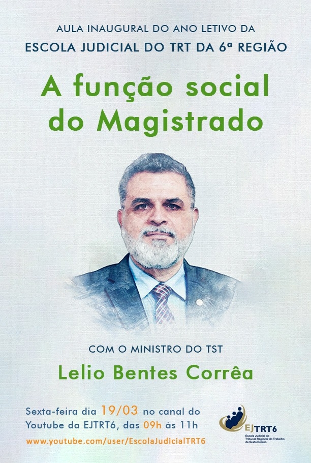 A Escola Judicial do TRT6 convida para a Aula Inaugural do Ano Letivo da Escola Judicial do TRT da 6ª Região, com palestra do Ministro do TST Lélio Bentes sobre o tema “A função social do magistrado”.