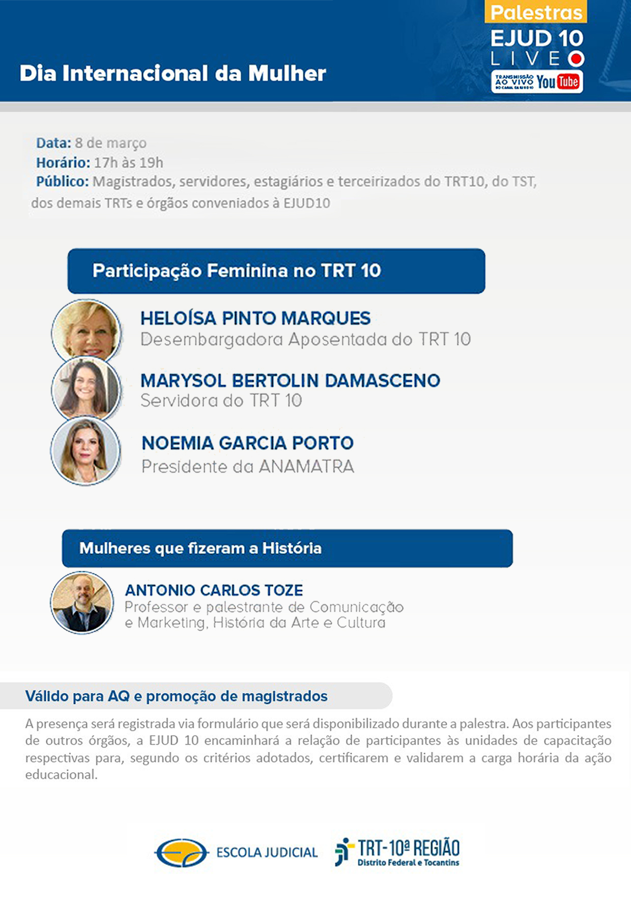 A Escola Judicial do TRT da 10ª Região, considerando as diretrizes traçadas pela ENAMAT de prática de compartilhamento de ações formativas, convida a todos a participarem da seguinte ação educacional "A Participação Feminina no Poder Judiciário". que será realizado no dia 08 de março das 17h às 19h, no canal do YouTube da EJUD10.