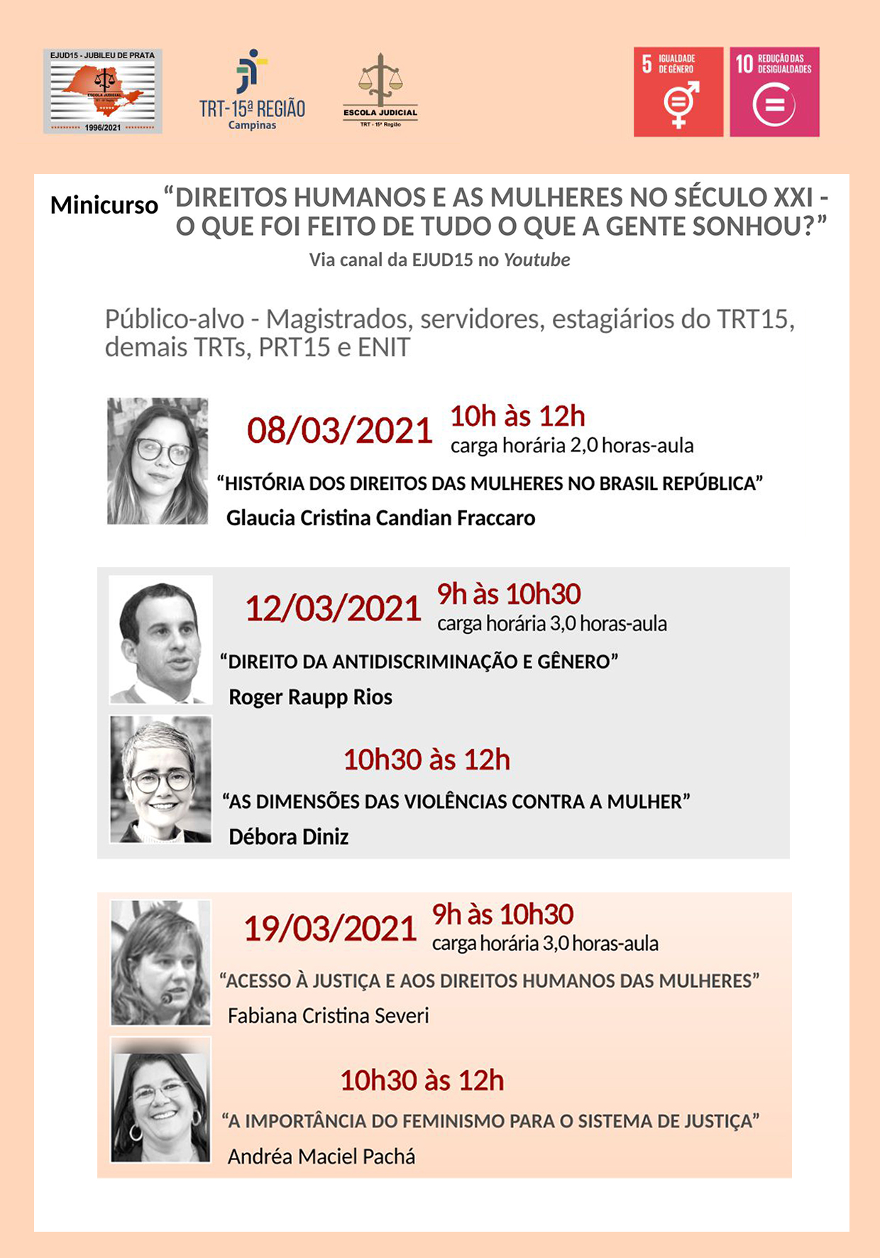 A Escola Judicial do TRT 15 convida para o Minicurso: "Direitos Humanos e as Mulheres no Século XXI - O que foi feito de tudo o que a gente sonhou?", que será realizado nos dias 8, 12 e 19 de março.