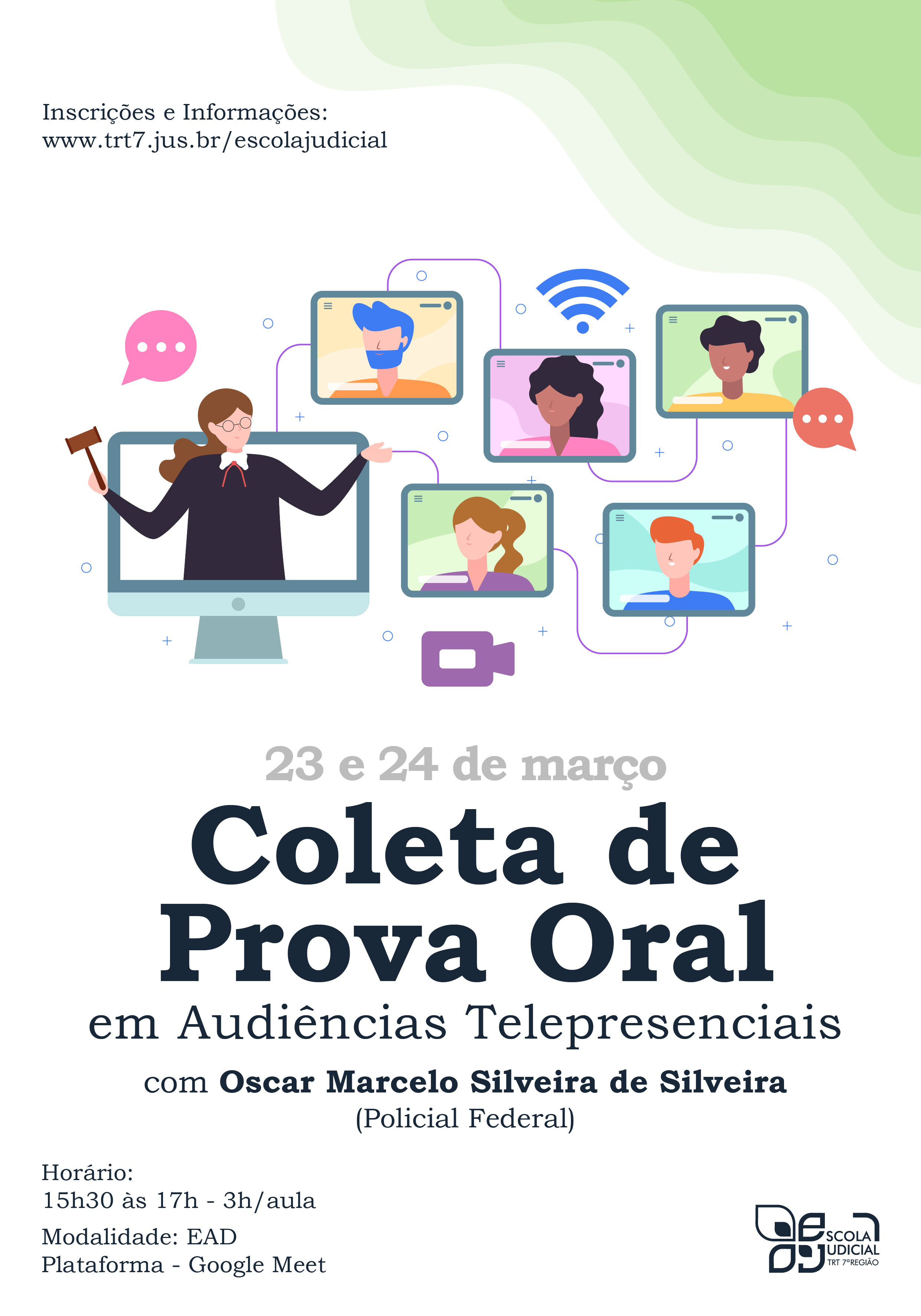 Inscrições abertas para o curso "Coleta de Prova Oral em Audiências Telepresenciais", que será ministrado pelo Sr. Oscar Marcelo Silveira de Silveira, na modalidade telepresencial - aulas síncronas, pelo Google Meet, nos dias 23 e 24 de março de 2021, das 15h30 às 17h.
