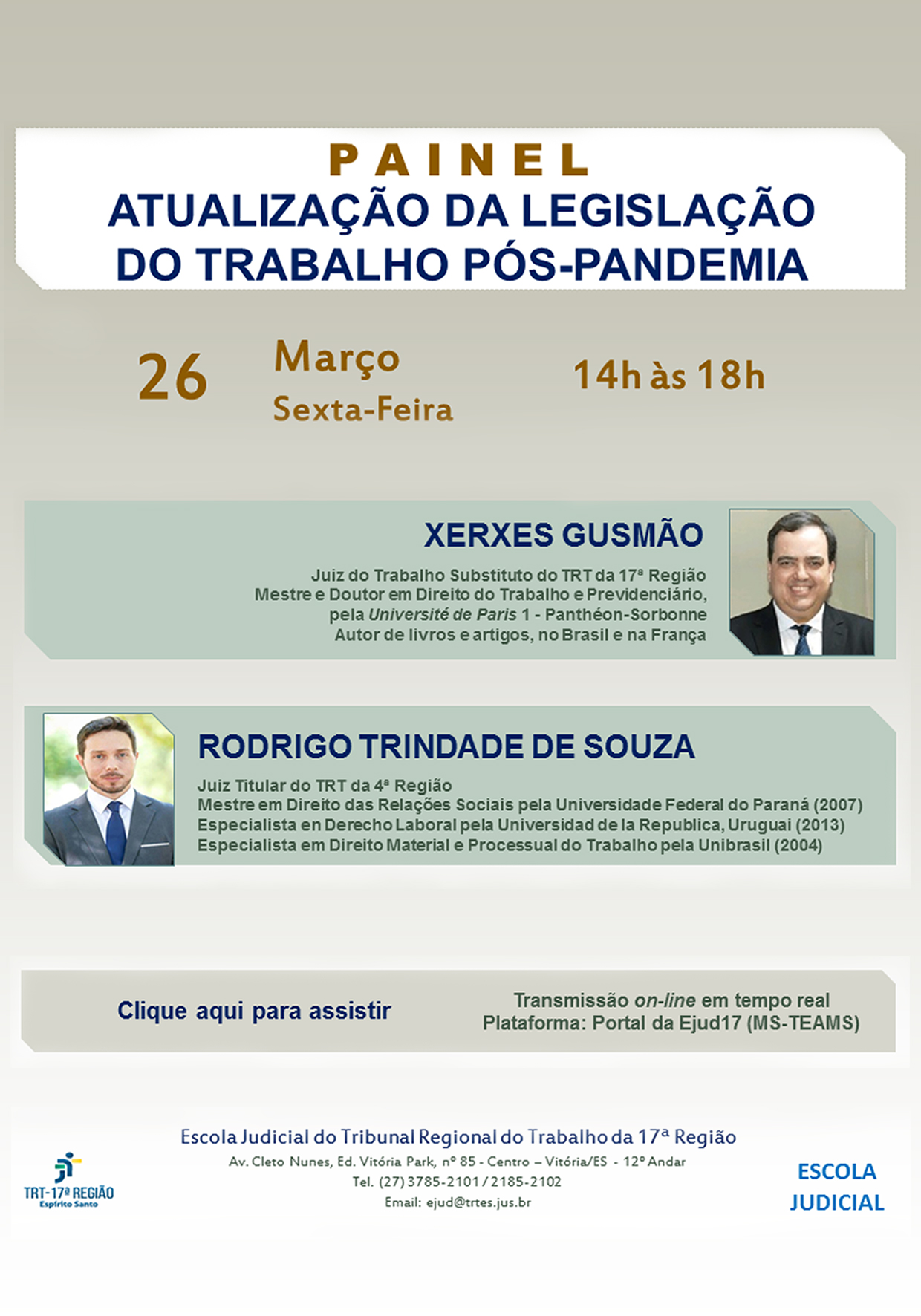 A Escola Judicial do TRT da 17ª Região convida para participar do Painel telepresencial abordando o tema "Atualização da legislação do trabalho pós-pandemia", que ocorrerá no dia 26 de março (Sexta-Feira), das 14h às 18h.