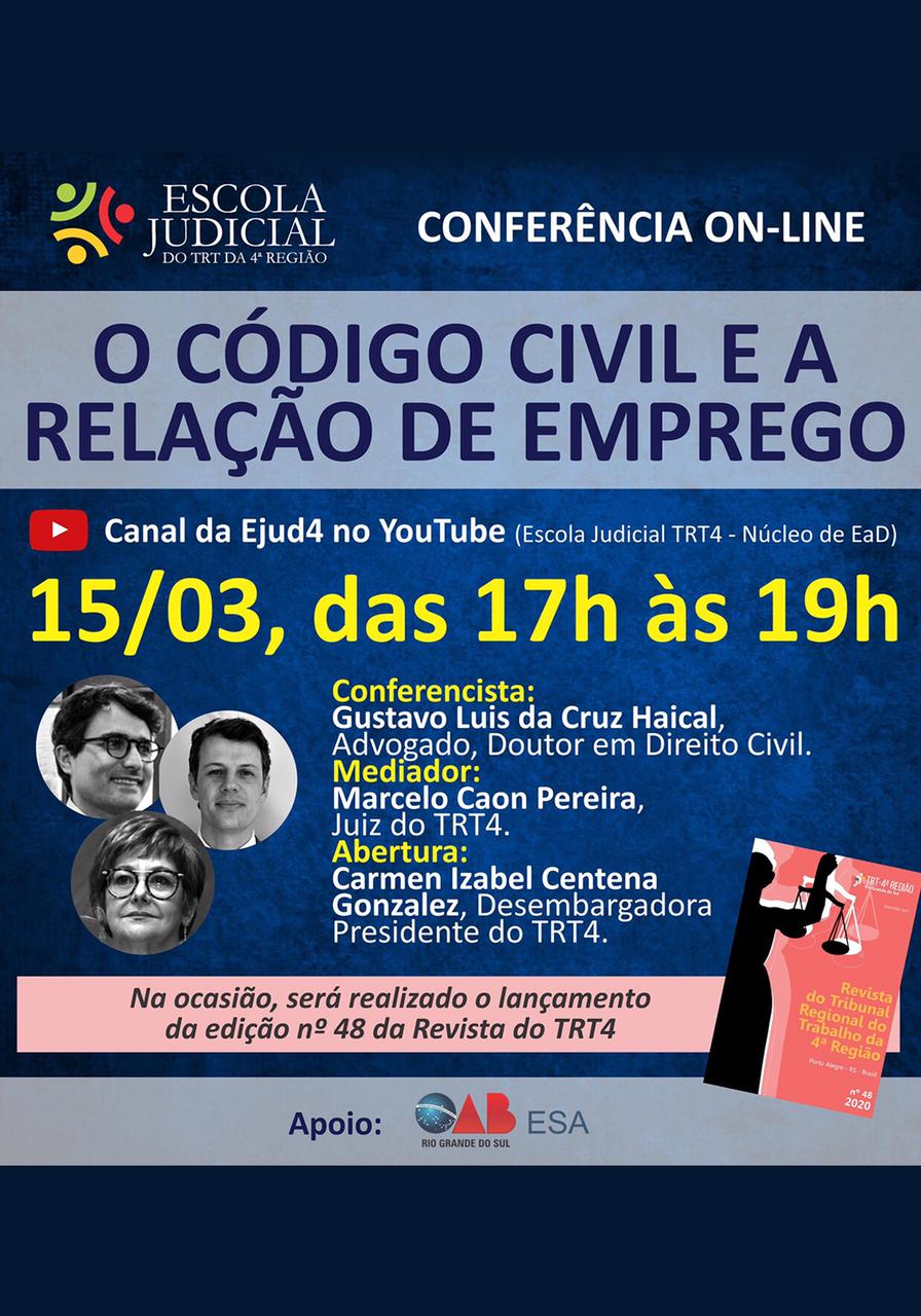 A Escola Judicial do TRT4 promove Conferência on-line: O Código Civil e a Relação de Emprego, por transmissão ao vivo no seu canal do Youtube. No dia 15 de março (segunda-feira), das 17h às 19h.