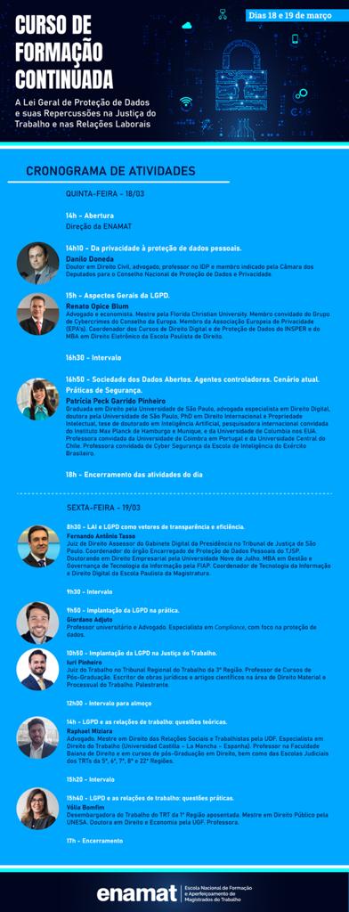 A Escola Nacional de Formação e Aperfeiçoamento de Magistrados do Trabalho - ENAMAT realizará Curso de Formação Continuada sobre A Lei Geral de Proteção de Dados e as suas Repercussões na Justiça do Trabalho e nas Relações Laborais, no período de 18 e 19 de março de 2021.