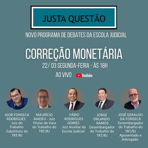 O Ciclo de Debates Justa Questão que está sendo realizado pela Escola Judicial do TRT da 1ª Região, será realizada o primeiro episódio com o tema "CORREÇÃO MONETÁRIA'' no dia 22 de março, às 18h, no canal do YouTube da Escola Judicial.