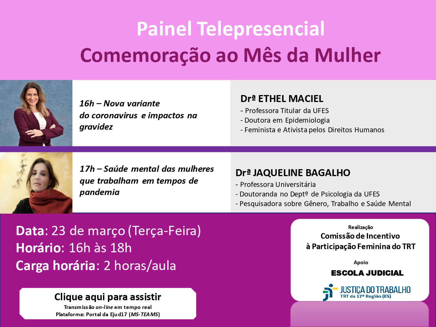 A Escola Judicial do TRT da 17ª Região convida para o Painel em comemoração ao Mês da Mulher que será realizado no dia 23 de março de 2021, das 16h às 18h, por meio de transmissão on-line.