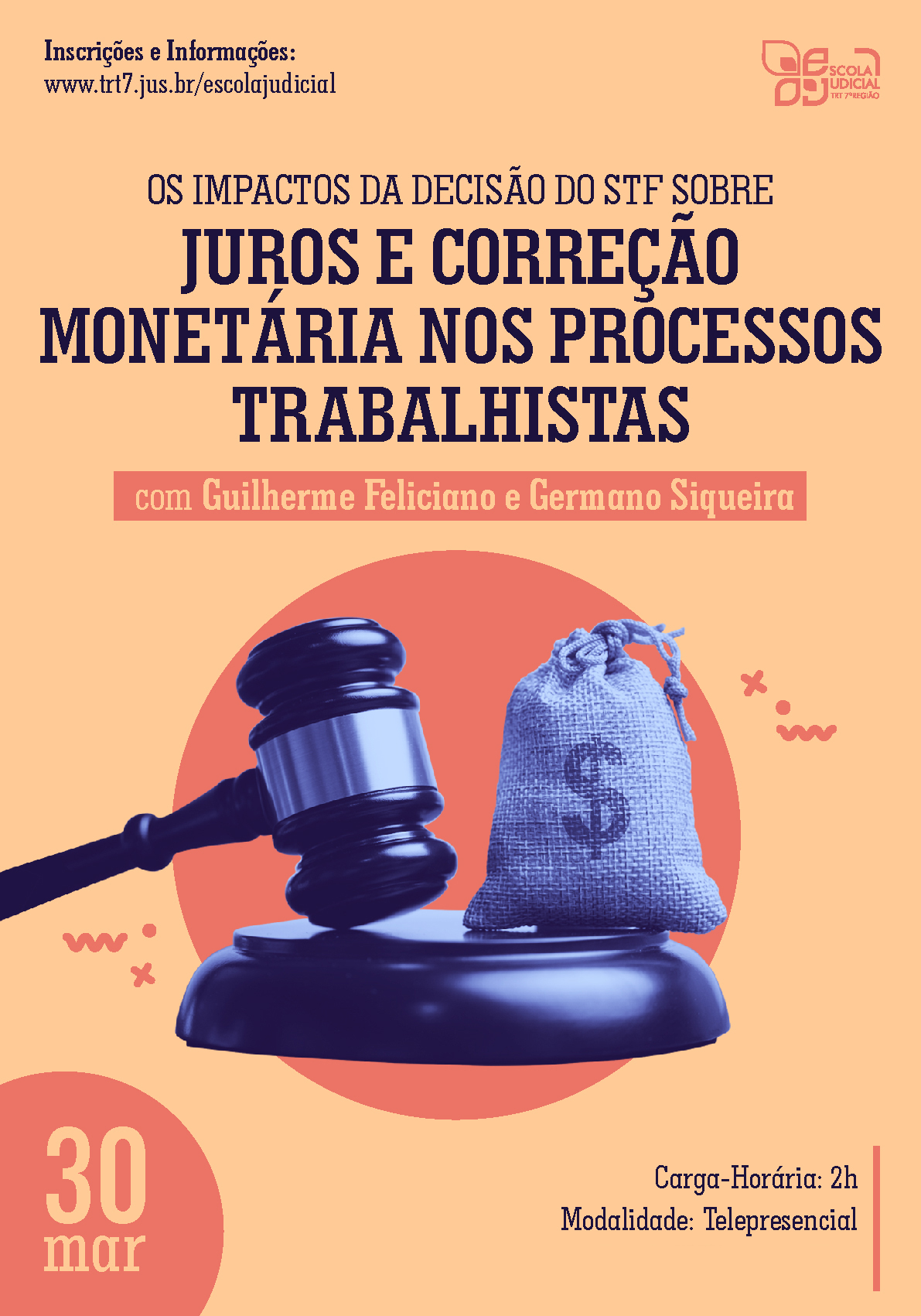 Inscrições abertas para a exposição dialogada sobre "Os impactos da decisão do STF sobre juros e correção monetária nos processos trabalhistas", que será ministrada pelo Dr. Germano Silveira de Siqueira, Juiz do Trabalho do TRT7 e o Dr. Guilherme Guimarães Feliciano, Juiz do Trabalho do TRT15, no dia 30 de março/2021, das 18h às 20h.
