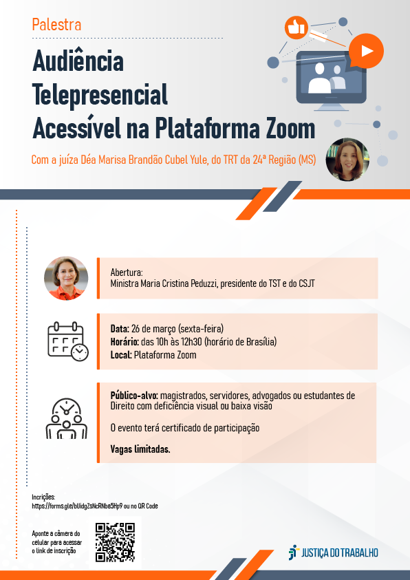 O Conselho Superior da Justiça do Trabalho, com o apoio da Comissão Permanente de Acessibilidade e Inclusão do Tribunal Regional do Trabalho da 24ª Região, promoverá no dia 26 de março/21, das 10h às 12h30, a palestra “Audiência Telepresencial Acessível (Plataforma Zoom)”, que será ministrada pela Juíza Déa Marisa Brandão Cubel Yule do TRT da 24ª Região (MS).