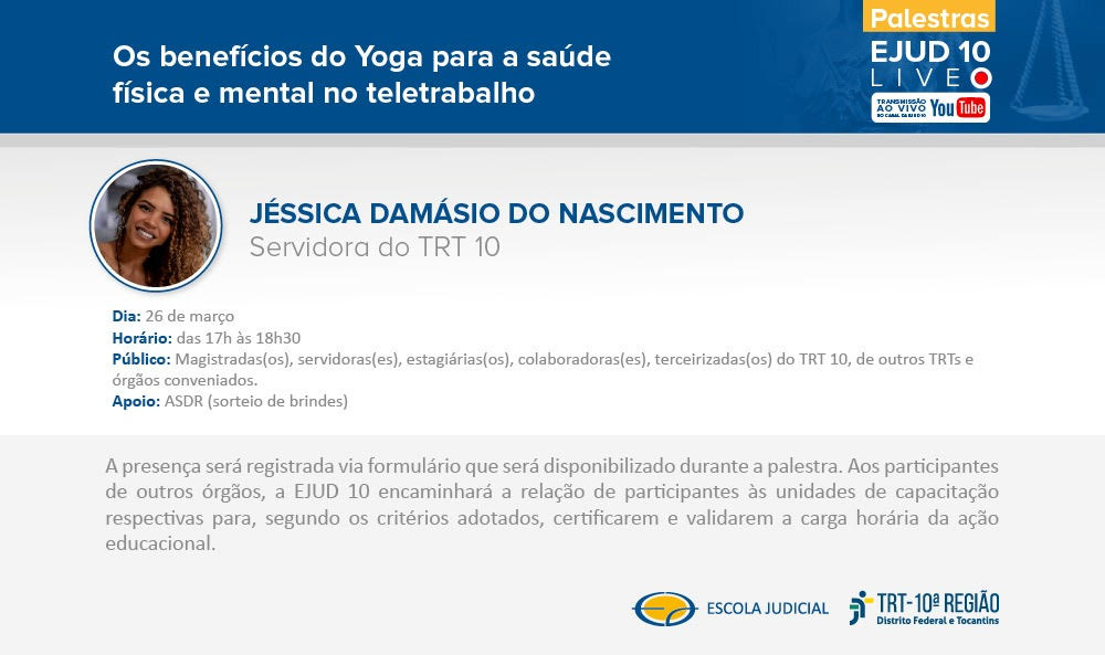 A Escola Judicial do TRT 10 convida para a live Os benefícios do Yoga para a saúde física e mental no teletrabalho que será realizada no dia 26 de março, das 17h às 18h30.