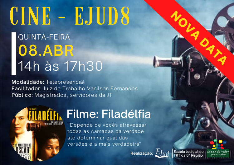 A Escola Judicial do TRT da 8ª Região, considerando a boa prática de compartilhamento de ações formativas, convida magistrados, servidores e estagiários dos TRTs a participar de nosso Cine-EJUD8: Filme Filadélfia de Jonathan Demme (EUA, 1993, 125min), no dia 25 de março de 2021 das 14h ás 17h30, pela plataforma Google-meet.