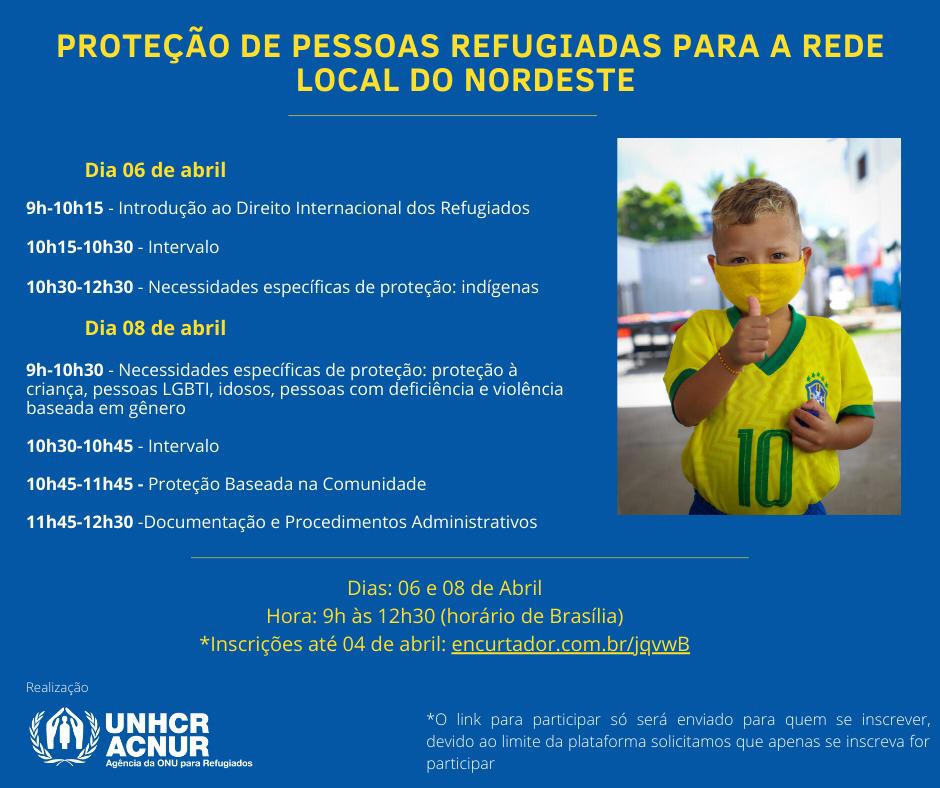 A Agência da ONU para Refugiados (ACNUR) está com inscrições abertas para o curso sobre Mecanismos de Proteção para Pessoas Refugiadas, que será ministrado pelo Alto Comissariado das Nações Unidas para refugiados (ACNUR), nos dias 06 e 08 de abril, das 9h às 12h30.