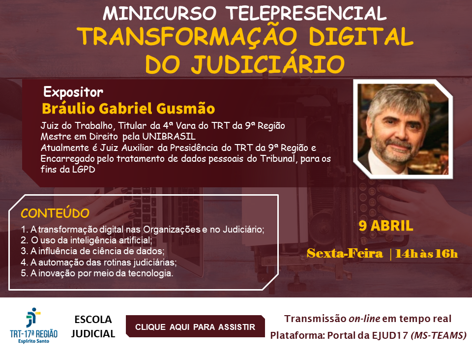 A Escola Judicial do TRT da 17ª Região convida para participar do Minicurso telepresencial,abordando o tema “Transformação digital do judiciário” , que ocorrerá no dia 09 de abril (Sexta-Feira), das 14h às 16h.