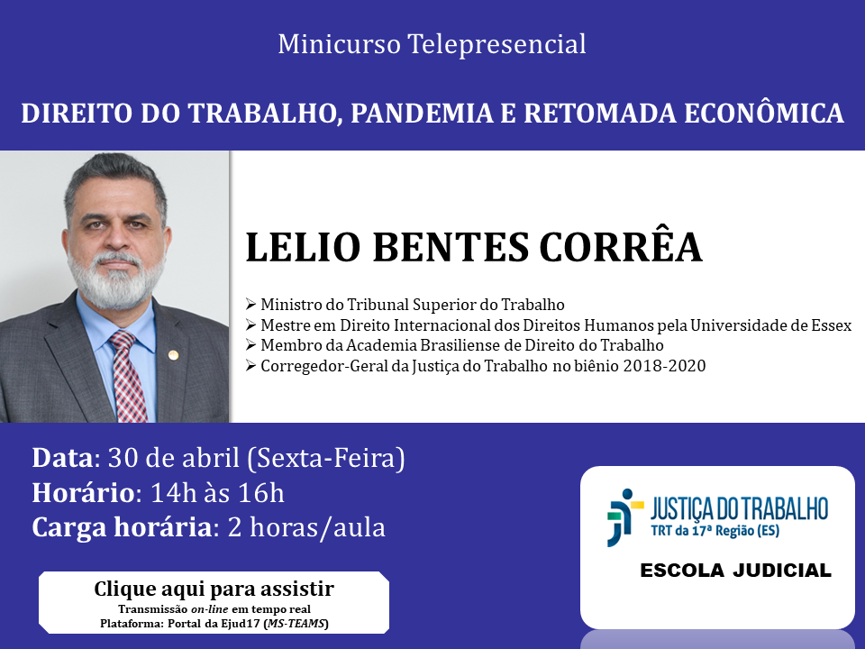 A Escola Judicial do TRT da 17ª Região convida para o minicurso Direito do Trabalho, Pandemia e Retomada Econômica, que será realizado no dia 30 de abril de 2021, das 14h às 16h, por meio de transmissão on-line, pela plataforma (portal da Ejud17)