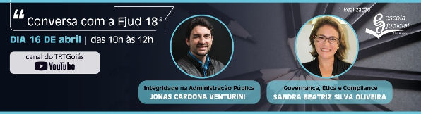 Governança, ética e compliance serão os temas da próxima edição do "Conversa com a Ejud 18", no dia 16 de abril, das 10h às 12h, com transmissão pelo canal do TRT Goiás no YouTube. O objetivo é fomentar uma cultura de ética e de comportamentos íntegros para prevenir possíveis ações fraudulentas ou corruptas com o propósito de alcançar a excelência na prestação de serviços para a sociedade.