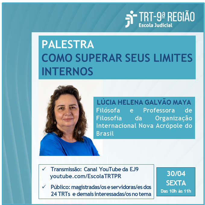 A Escola Judicial do TRT do Paraná (9ª Região) transmitirá ao vivo, no seu Canal do YouTube, a palestra “Como superar seus limites internos”, no dia 30 de abril, das 10h às 11h, com a filósofa Lúcia Helena Galvão Maya. A palestrante é professora de filosofia da Organização Internacional Nova Acrópole do Brasil.