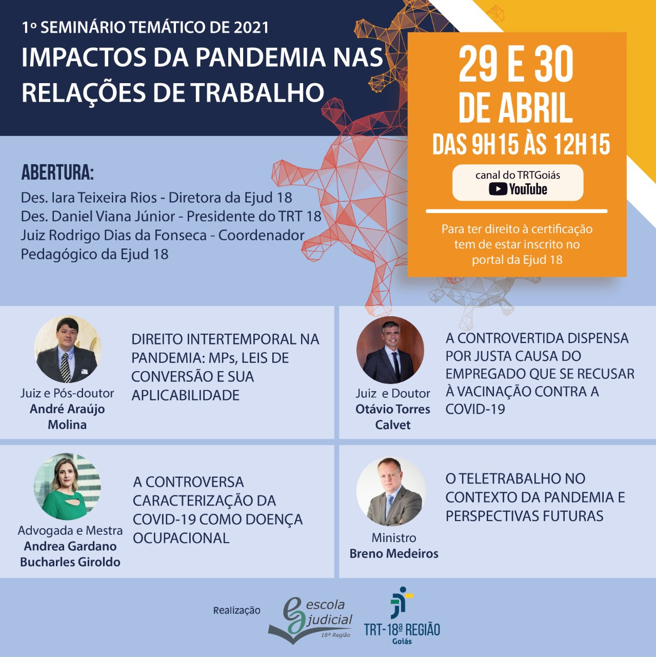A Escola Judicial do TRT 18 encaminha convite para o 1º Seminário Temático de 2021 – “Impactos da pandemia nas relações de trabalho”, que será realizado nos dias 29 e 30 de abril, das 9h15min às 12h15min. O evento terá carga horária total de 6 horas.