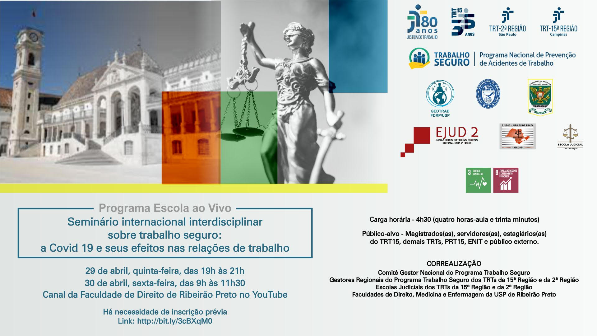 A Escola Judicial do TRT15 convida para participar do Programa Escola ao Vivo com "Seminário internacional interdisciplinar sobre Trabalho Seguro: a COVID-19 e seus efeitos nas relações de trabalho", nos dias 29 e 30 de abril, com carga horária de 4h30 min.