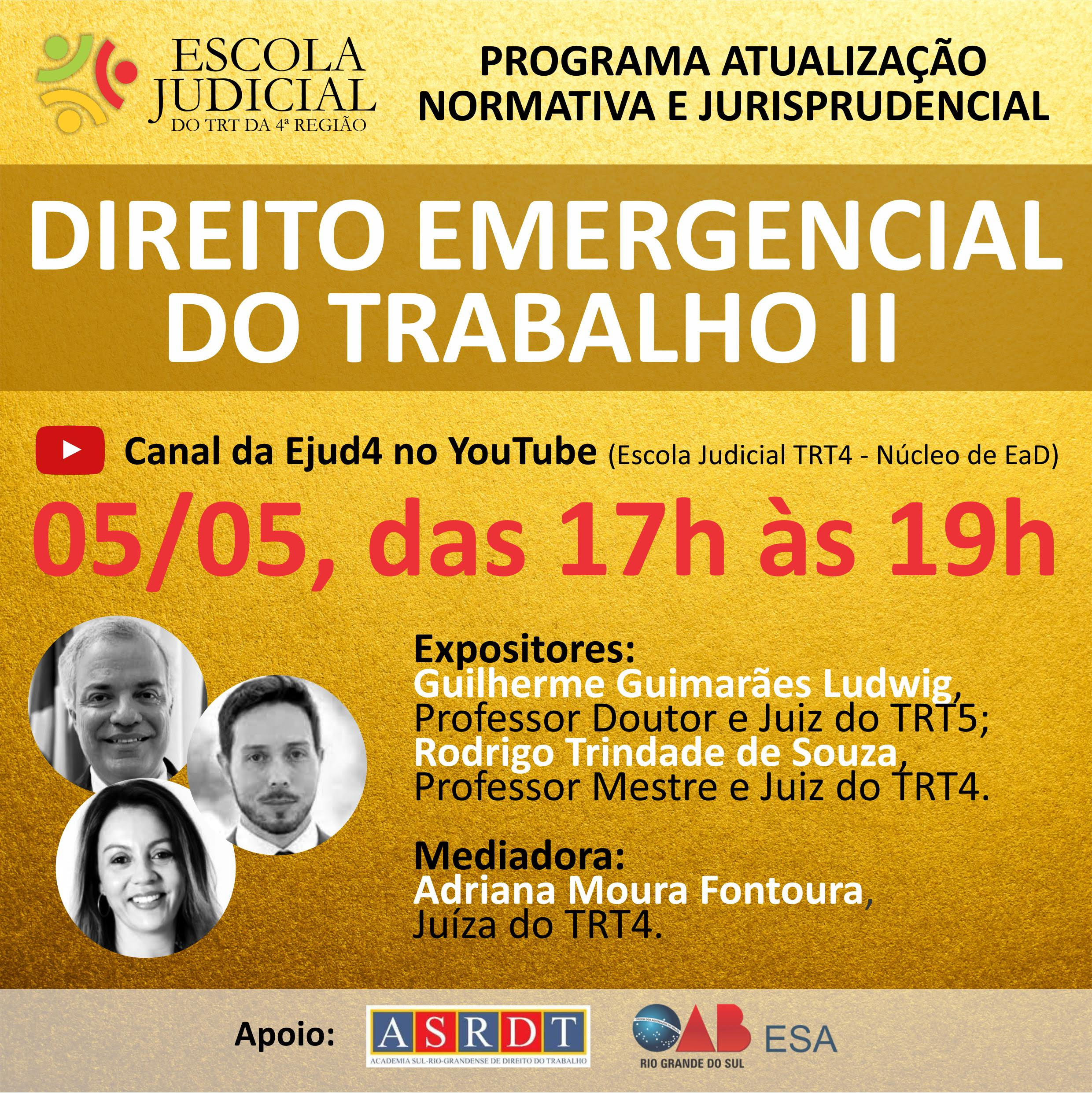 Como acessar: Diretamente no canal da Ejud4 no YouTube (Escola Judicial TRT4 - Núcleo de EaD), na data e horário indicados, e clicar na transmissão.