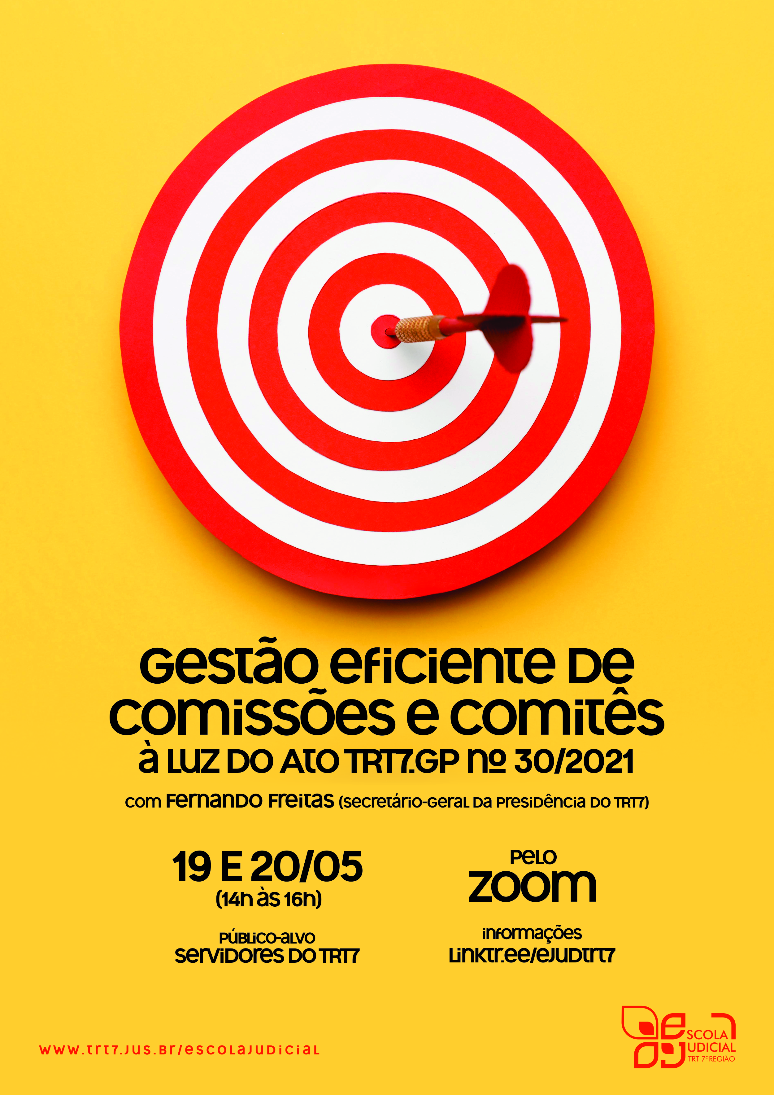 Conteúdo Programático: Contextualização - O Ato TRT7.GP nº 30/2021 e a importância do funcionamento efetivo de comissões e comitês; Foco nas entregas; Composição, funções e atribuições; Artefatos, gestão do conhecimento e transparência no âmbito de comissões e comitês; Reuniões céleres e eficazes.