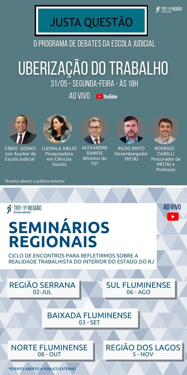 O Ciclo de Debates Justa Questão que está sendo realizado pela Escola Judicial do TRT da 1ª Região, será realizado episódio com o tema "UBERIZAÇÃO DO TRABALHO'' no dia 31 de maio, às 18h, no canal do YouTube da Escola Judicial.