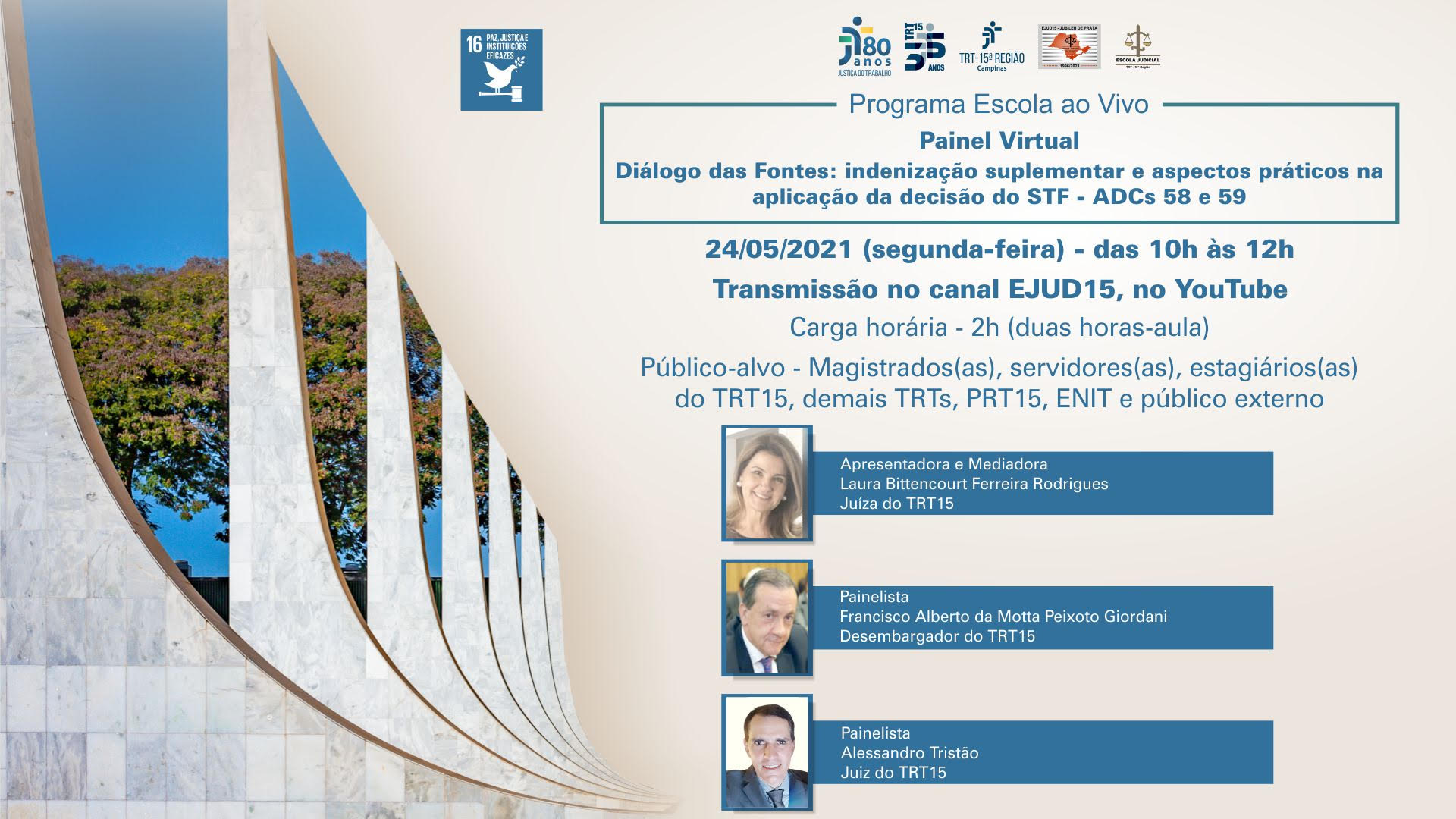 Escola Judicial do TRT 15 convida para Painel Virtual - "Diálogo das Fontes: indenização suplementar e aspectos práticos na aplicação da decisão do STF-ADCs 58 e 59", no dia 24 de maio de 2021 das 10h às 12h.
