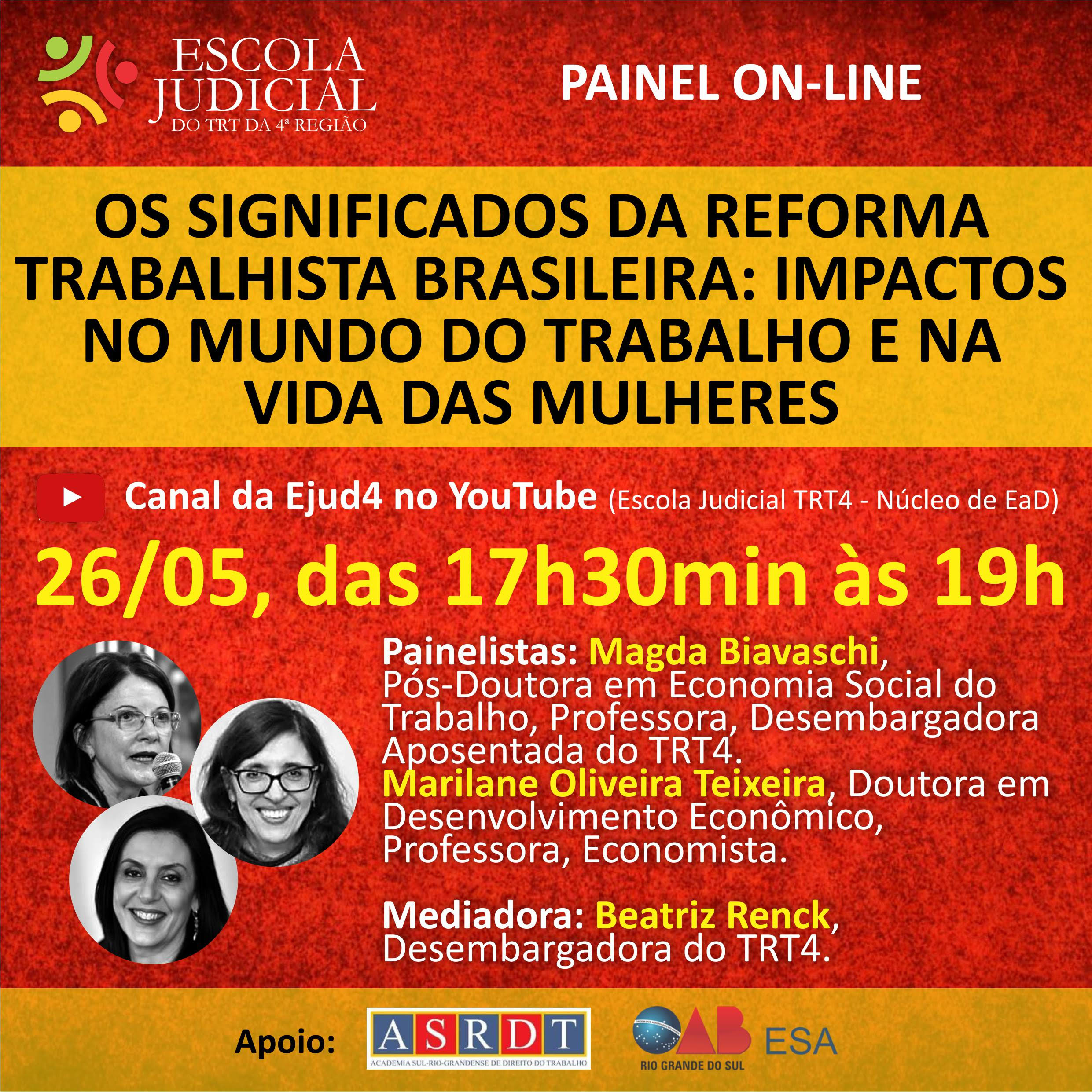 A Escola Judicial do TRT4 convida para o Painel On-Line - Os Significados da Reforma Trabalhista Brasileira: Impactos no Mundo do Trabalho e na Vida das Mulheres, que será realizada no dia 26 de maio, das 17h30min às 19h, no canal da Ejud4 no YouTube.