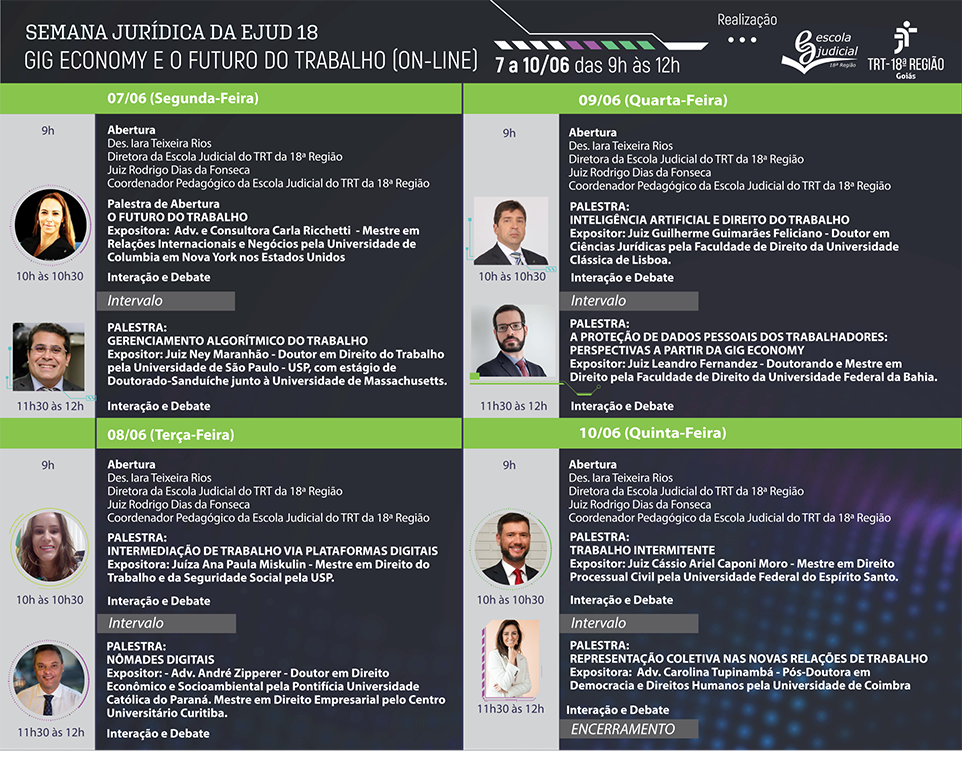 A Escola Judicial do TRT 18 encaminha convite para Semana Jurídica para discutir o novo modelo das relações de trabalho na Gig Economy que será realizado nos dias 07 a 10 de junho, das 9h às 12h, destinado aos magistrados, procuradores do trabalho, servidores, advogados e à comunidade jurídica em geral. A transmissão do evento será pelo canal do YouTube da Escola Judicial.