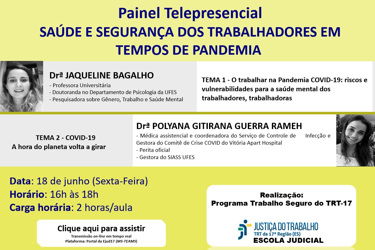A Escola Judicial do TRT da 17ª Região convida para participar do Painel Telepresencial,abordando o tema "Saúde e Segurança dos Trabalhadores em tempos de Pandemia", que ocorrerá no dia 18 de junho (sexta-Feira), das 16h às 18h, com carga horária de 2 horas, o painel será ministrado por Drª Jaqueline Bagalho e Drª Polyana Gitirana Guerra Rameh.