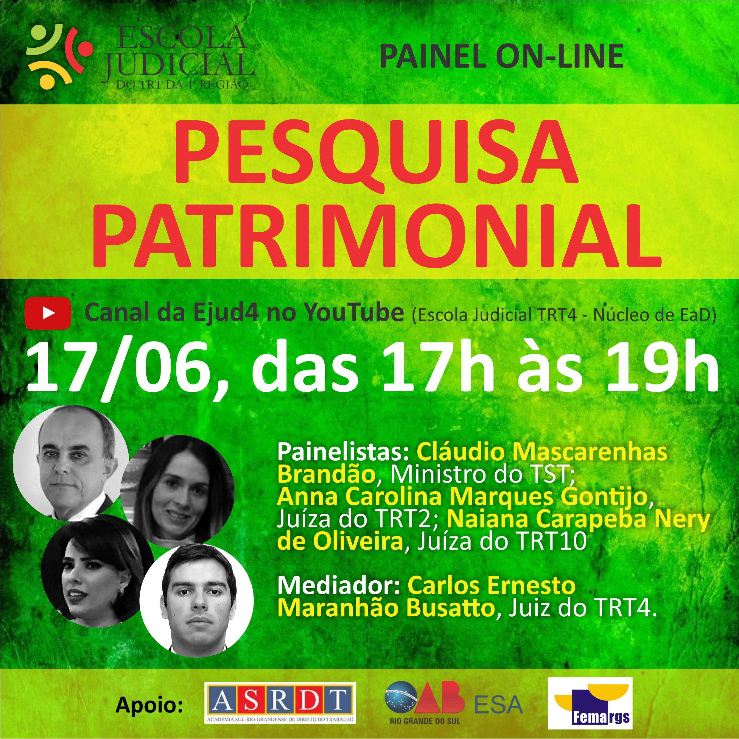 A Escola Judicial do TRT4 convida para o "Painel On-Line - Pesquisa Patrimonial",que será realizada no dia 17 de junho, das 17h às 19h, no canal da Ejud4 no YouTube.