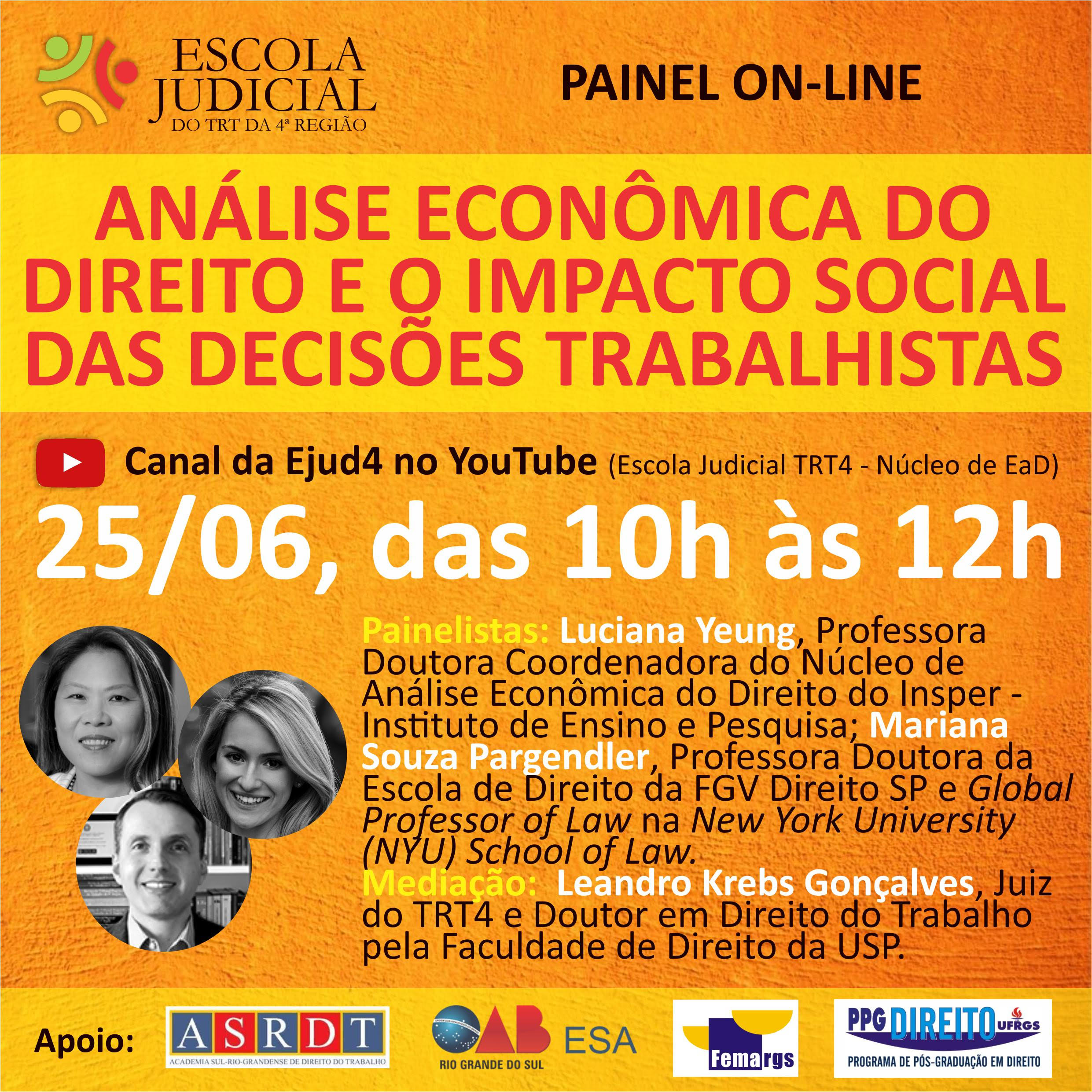 A Escola Judicial do TRT4 convida para o Painel On-Line Análise Econômica do Direito e o Impacto Social das Decisões Trabalhistas, que será realizada no dia 25 de junho, das 10h às 12h, no canal da Ejud4 no YouTube.
