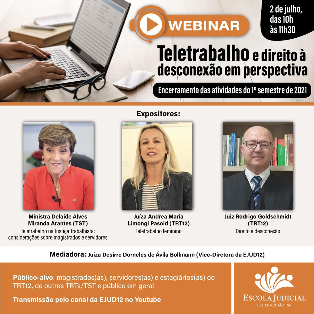 A Escola Judicial do TRT12 convida para o Webinário Teletrabalho e direito à desconexão em perspectiva ( atividade de encerramento do primeiro semestre de 2021), que será realizado no dia 02 de julho a partir das 10h às 11h30min.