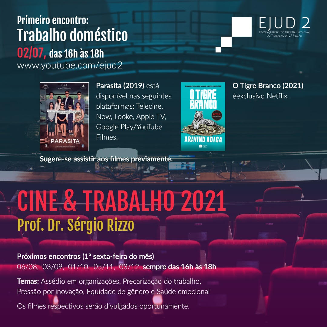 A EJUD2 iniciará um ciclo de palestras chamado "Cine&Trabalho2021". O ciclo será composto de 6 encontros. O primeiro encontro com o tema Trabalho Doméstico, será realizado no dia 02/07/2021 (Sexta-feira), das 16h às 18h. O ciclo terá como palestrante o Professor Sergio Rizzo.