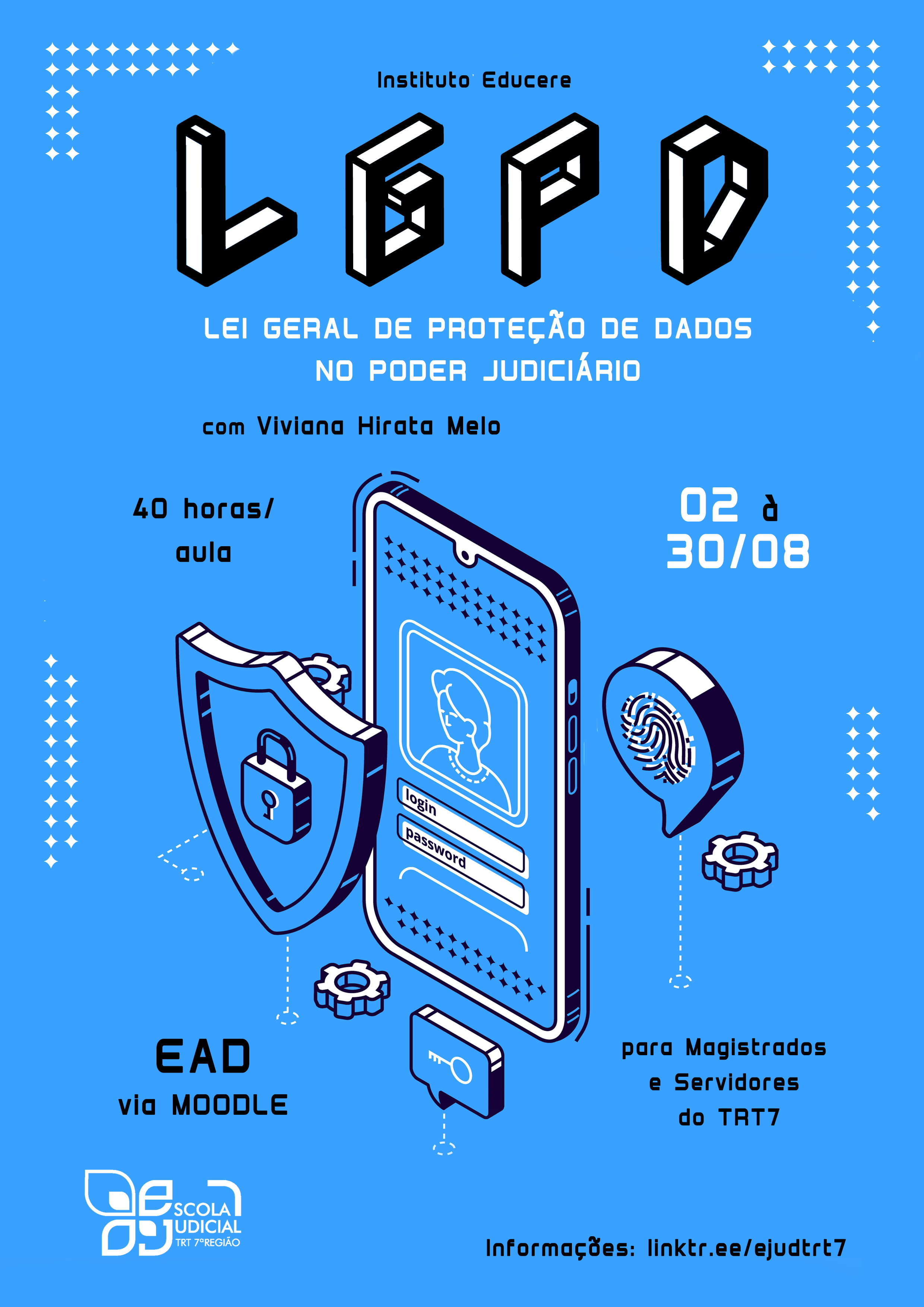 Com a carga horária de 40 horas/aula, o curso tem como objetivo capacitar os participantes acerca dos conceitos, direitos, deveres e implementação da Lei Geral de Proteção de Dados (LGPD) no Poder Judiciário.