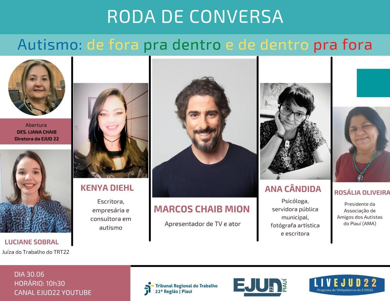 A EJUD22 promoverá Roda de Conversa AUTISMO: DE FORA PRA DENTRO E DE DENTRO PRA FORA, no dia 30 de junho 2021, das 10h30min às 12h30min, pelo Canal da EJUD22 no Youtube.