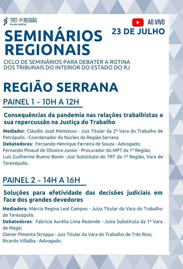 A Escola Judicial do TRT1 convida para o Ciclo de Seminários Regionais - Região Serrana, no seu canal do YouTube. O primeiro ciclo de encontros para refletirmos sobre a realidade trabalhista do interior do Estado do Rio de Janeiro. Nos meses seguintes, o Ciclo de Seminários contará também com encontros das áreas Sul Fluminense, Baixada Fluminense, Norte Fluminense e Região dos Lagos.