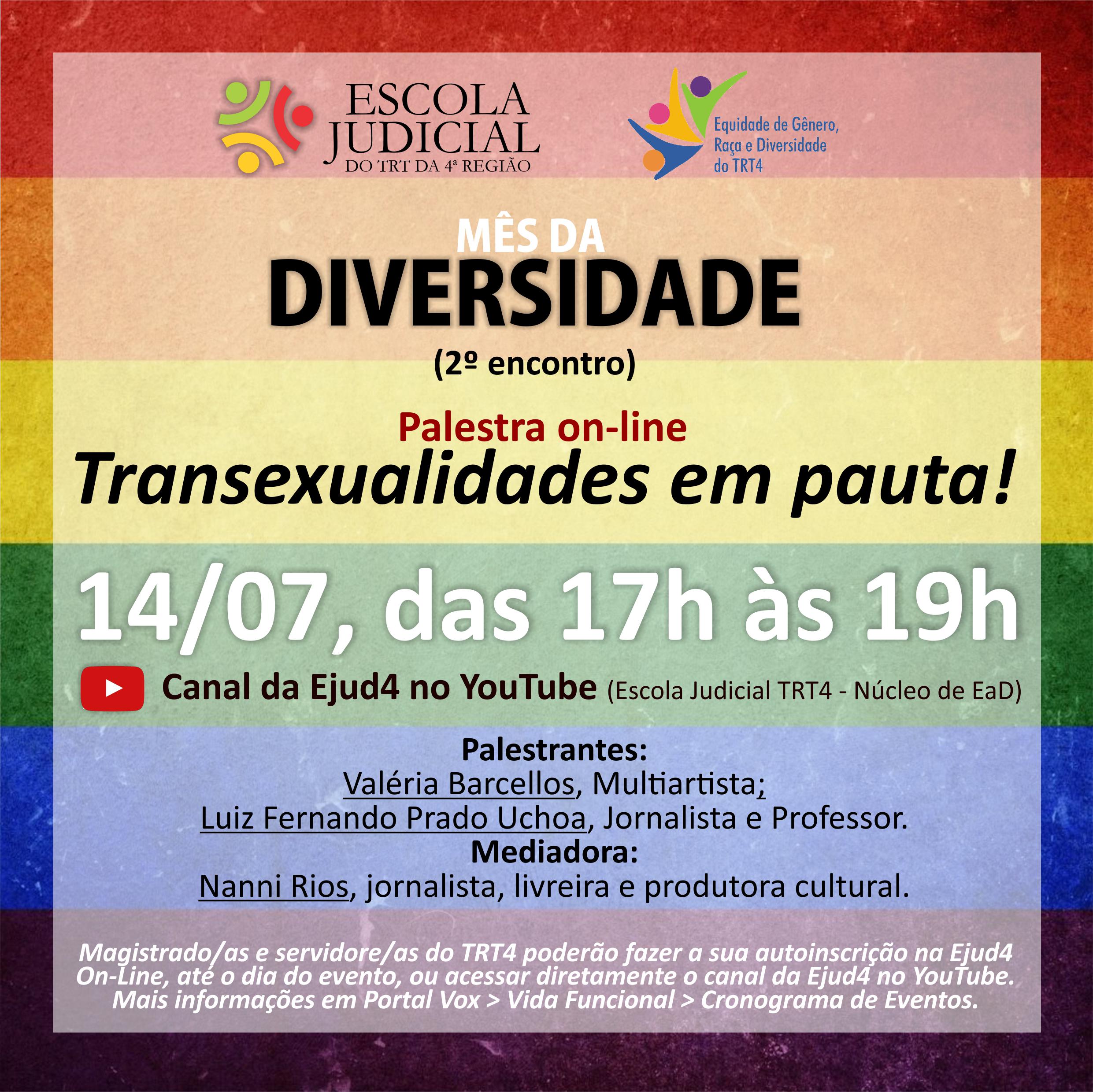 A Escola Judicial do TRT4 convida para o Mês da Diversidade (2º encontro) Transsexualidade em Pauta, no canal da Ejud4 no YouTube.