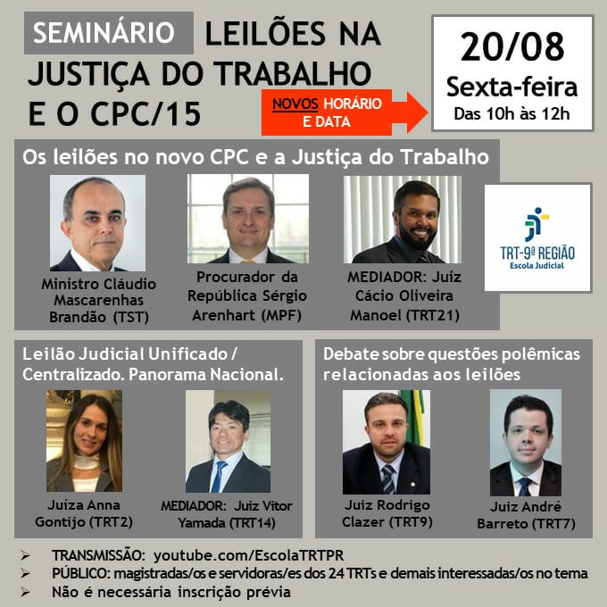 A Escola Judicial do TRT9 convida para o seminário “Leilões na Justiça do Trabalho e o CPC/15, que será transmitido em uma nova data, dia 20 de agosto de 2021 das 10h às 12h, no seu Canal do YouTube.