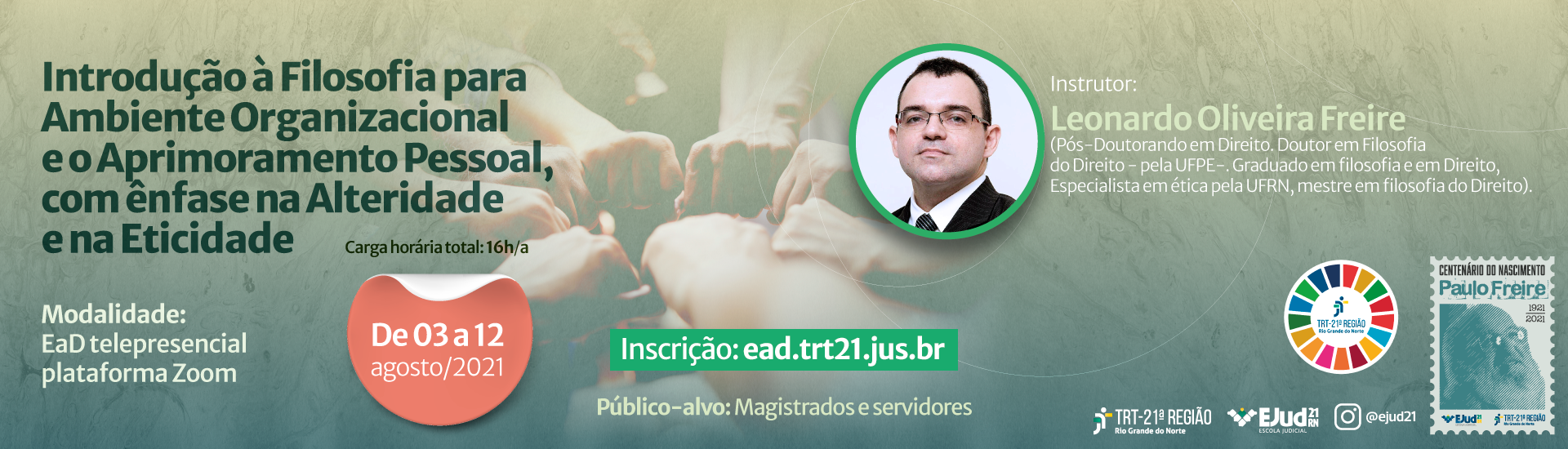 A Escola Judicial do TRT21 convida a todos para o curso "Introdução à filosofia para ambiente organizacional e o aprimoramento pessoal, com ênfase na alteridade e na eticidade”, na modalidade telepresencial, nos dias 03, 05, 10 e 12 de agosto, das 14h às 18h, por meio da Plataforma Moodle da EJud21, com carga horária síncrona total de 16h. Ao todo, são ofertadas 40 vagas.