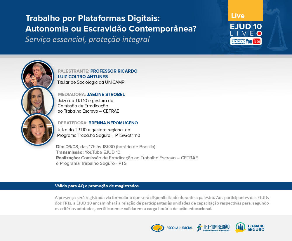 A Escola Judicial do TRT da 10ª Região, considerando as diretrizes traçadas pela ENAMAT de prática de compartilhamento de ações formativas, convida a todos a participarem da Live: Trabalho por Plataformas Digitais: Autonomia ou Escravidão Contemporânea?, que será realizado pela Comissão de Erradicação ao Trabalho Escravo - CETRAE e Programa Trabalho Seguro - PTS no dia 06 de agosto das 17h às 18h30, no canal do YouTube da EJUD10.